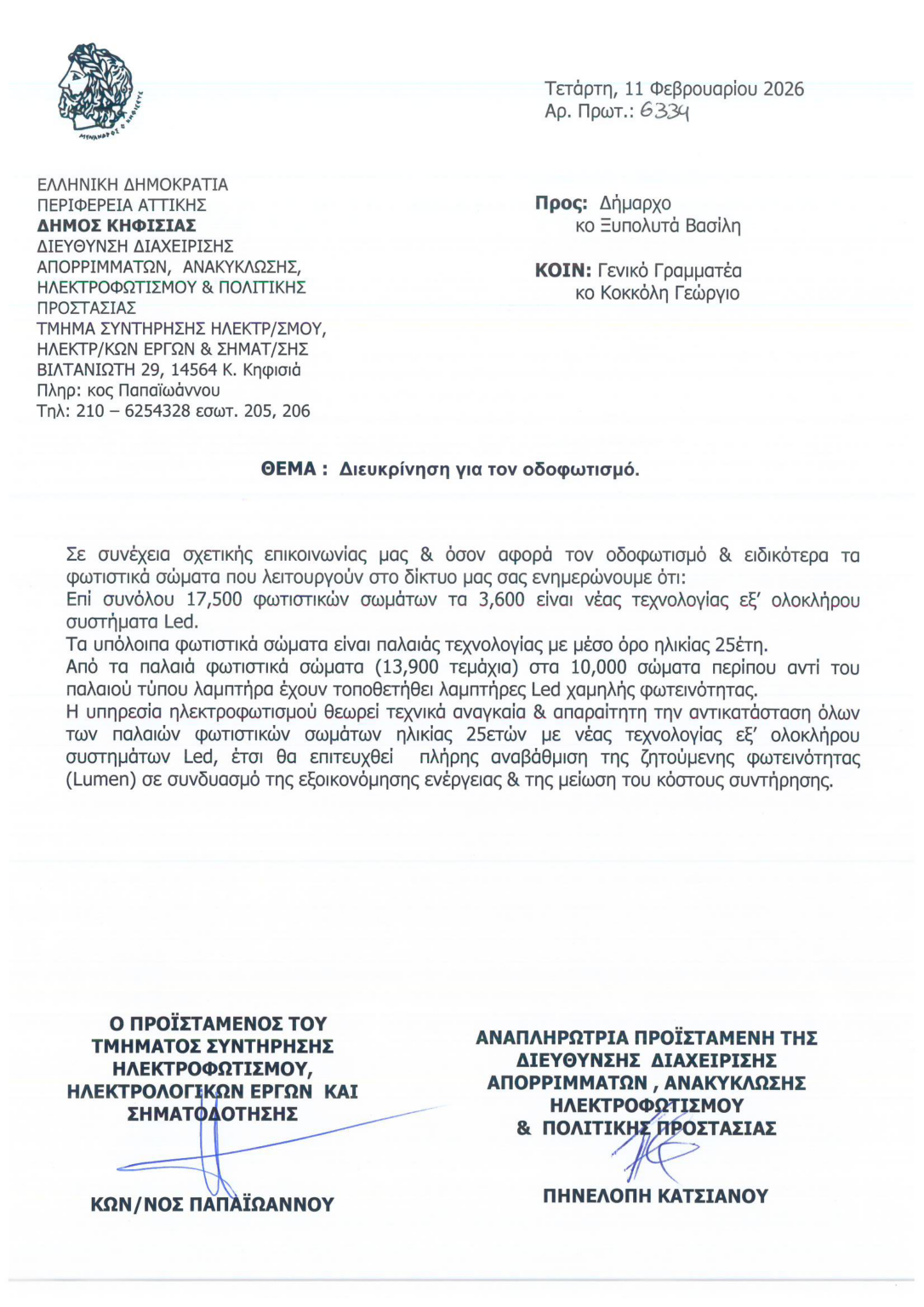 Την Παρασκευή 13 Φεβρουαρίου, ο Δήμος Κηφισιάς δημοσιοποίησε την επίσημη απάντηση του προϊσταμένου του Τμήματος Συντήρησης Ηλεκτροφωτισμού, Κωνσταντίνου Παπαϊωάννου, σε σχετικό ερώτημα της Δημοτικής Αρχής. Η απάντηση, με αριθμό πρωτοκόλλου 6334/11-2-2026, καταρρίπτει πλήρως τους ισχυρισμούς της προηγούμενης διοίκησης.