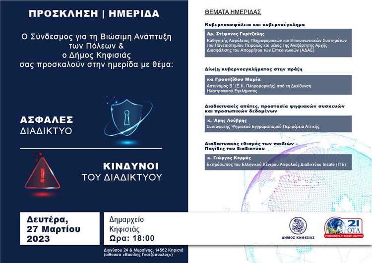 Μια άκρως ενδιαφέρουσα και επίκαιρη ενημερωτική ημερίδα με θέμα «Ασφαλές Διαδίκτυο – Κίνδυνοι του Διαδικτύου» συνδιοργανώνουν ο Σύνδεσμος για τη Βιώσιμη Ανάπτυξη των Πόλεων και ο Δήμος Κηφισιάς.