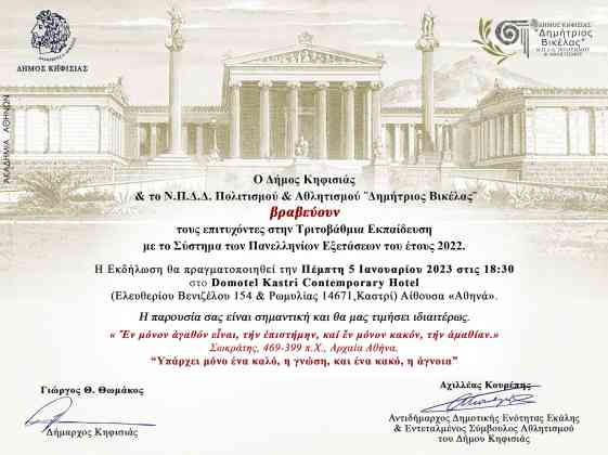 Ο Δήμος Κηφισιάς και το Ν.Π.Δ.Δ Πολιτισμού – Αθλητισμού «ΔΗΜΗΤΡΙΟΣ ΒΙΚΕΛΑΣ» βραβεύουν τους επιτυχόντες στην Τριτοβάθμια Εκπαίδευση με το Σύστημα των Πανελληνίων Εξετάσεων του έτους 2022.